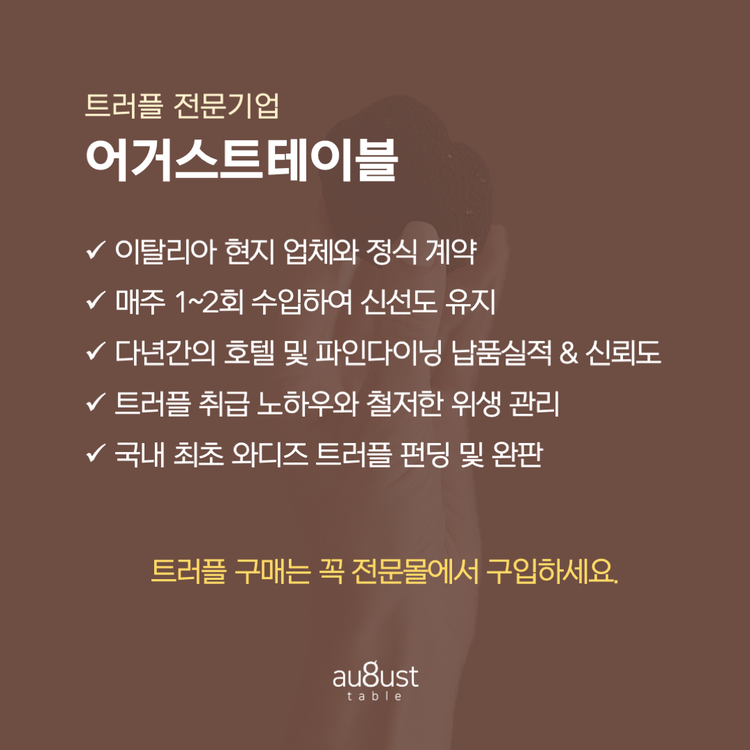 어거스트테이블은 현지 기업들과 정식 계약 후 신선한 트러플을 수입하고 있습니다.