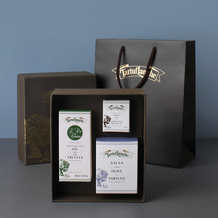 향이 은은한 블랙 트러플 오일 100ml. 화이트 트러플 소금 30g, 트러플 올리브 소스로 구성된 고급 패키지입니다. (금박 로고가 인쇄된 상자와 쇼핑백 포함)