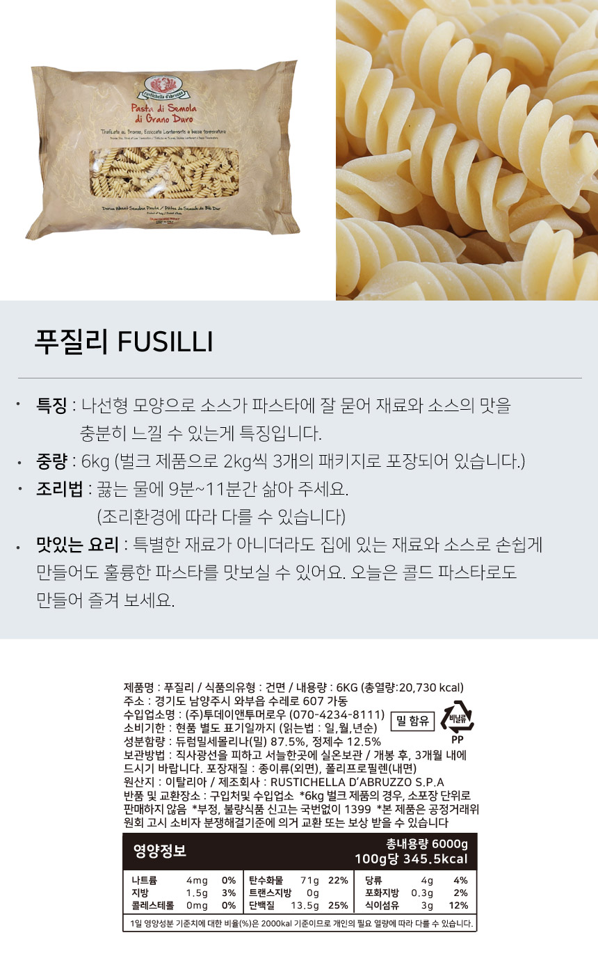 루스티켈라 푸질리(Fusilli) 파스타는 나선형 모양의 쇼트 파스타로 샐러드나 냉파스타로도 아주 잘 어울리는 매우 대중적인 파스타로 나선형의 홈 사이로 소스를 머금어 더욱 진한 풍미의 파스타를 만드실 수 있습니다.